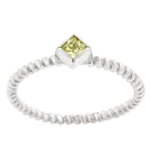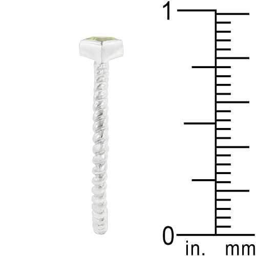 This petite solitaire ring features a unique twisting shank and a pretty peridot cubic zirconia. Genuine Rhodium Plating is achieved using an electroplating process that coats the item with heavy layers of rhodium a close cousin to platinum which gives our jewelry a platinum luster.