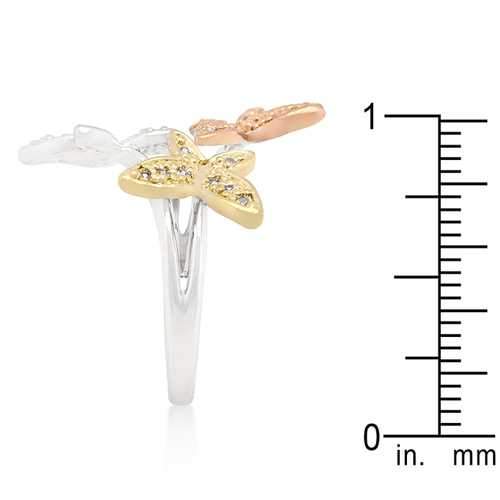A trio of gold rose and silver colored butterflies centered with sparkling cubic zirconia adorn this ring. Our two-tone and tri-tone process use 18k gold that electroplated coating the item with heavy layers of 18k yellow gold giving it that 14k hamiliton gold polished look. The silver tone is achieved by applying a heavy coating of genuine rhodium to the item giving is a lustrous silver tone high polish.