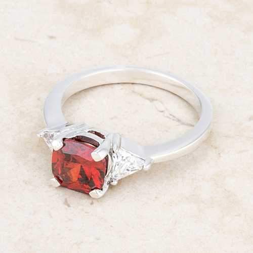 A pair of clear trillion cut stones accompany a ruby cushion cut center stone in this elegantly simple 1.8 carat engagement ring. A modern twist on a classic piece.Base Metal: Lead Free Alloy (brass)Style: , Setting Type: ProngMaterials: , Stone Cut: Cushion|TrillionColor: , Plating Color: RhodiumRing Band Width: 2.2mmStone Size:...