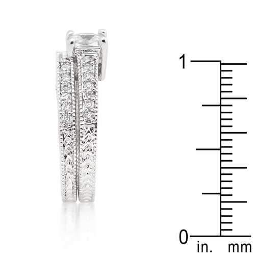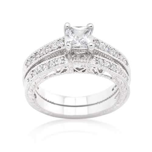 Delicately drawn designs surround this set's princess cut stone and round cut accents. Our genuine rhodium finish is achieved using an electroplating process that coats the item with heavy layers of rhodium a close cousin to platinum which gives our jewelry a platinum luster.